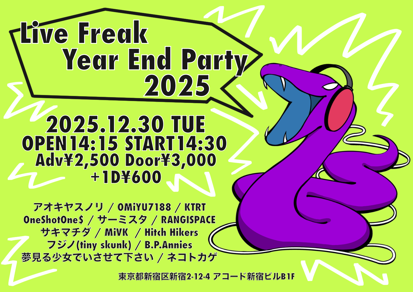 adv ¥2,500 / door ¥3,000 学割¥1,000OFF ※受付にて学生証を提示してください(22歳以下) 1ドリンク 600円