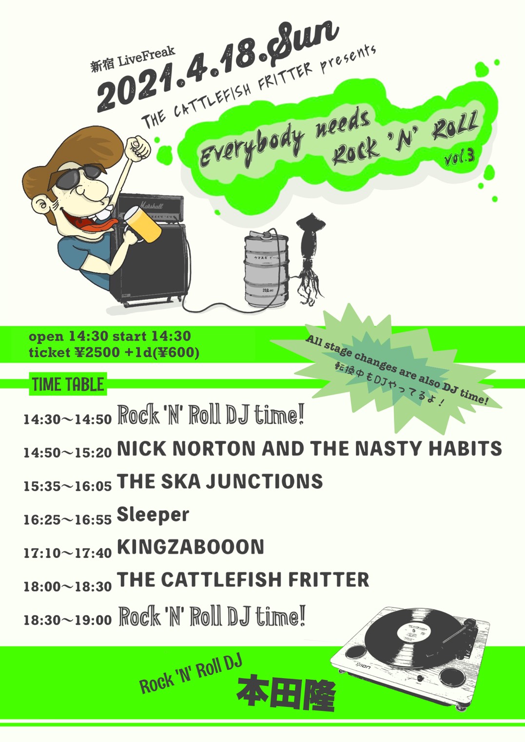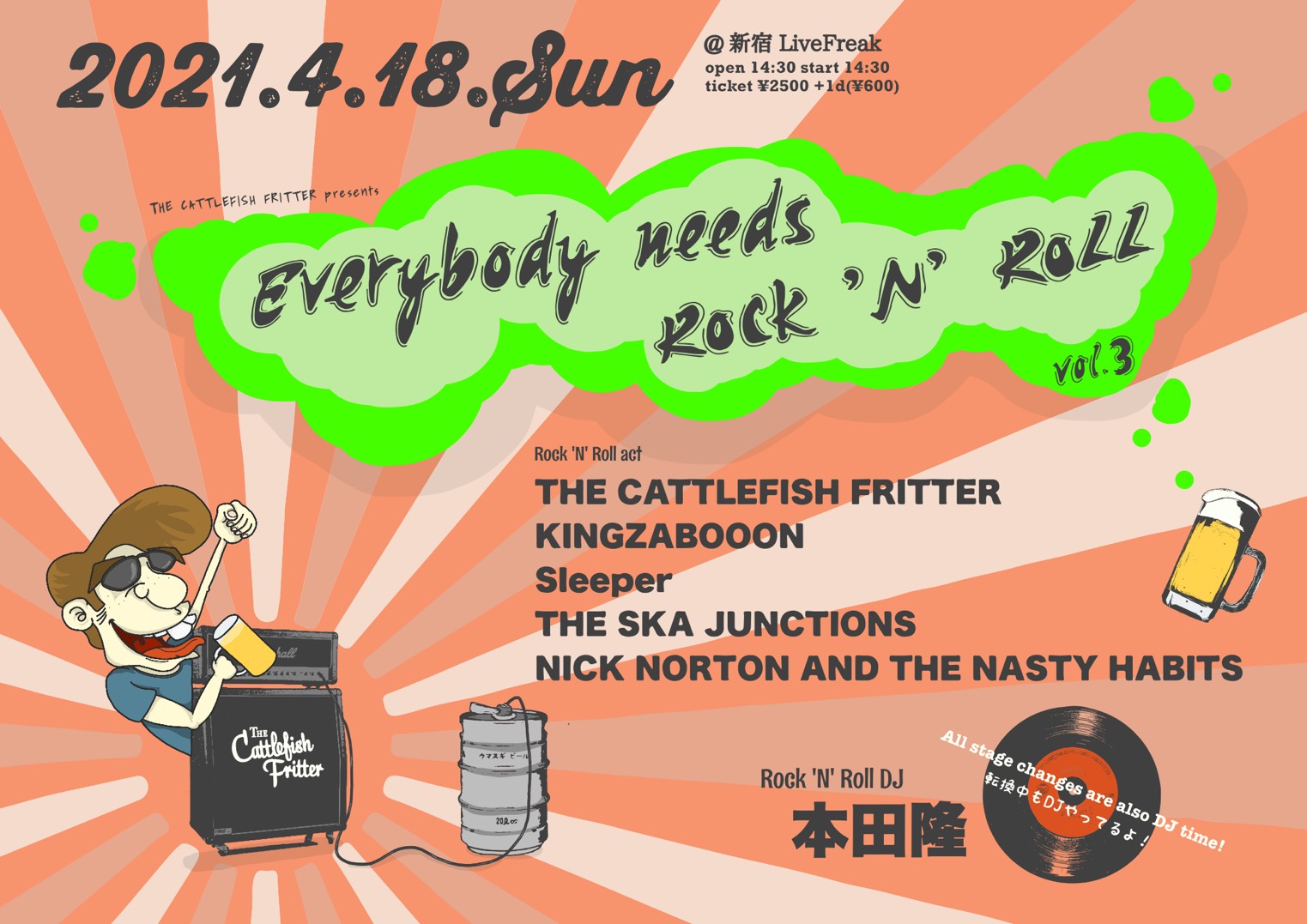 出演者 THE CATTLEFISH FRITTER KINGZABOOON Sleeper THE SKA JUNCTIONS Nick Norton and the Nasty Habits 〈R&R DJ〉 本田隆 OPEN 14:30 / START 15:00 ADV:¥2,500 / DOOR:¥2,500 (+1Drink)