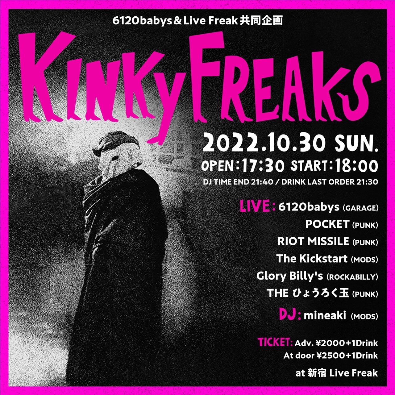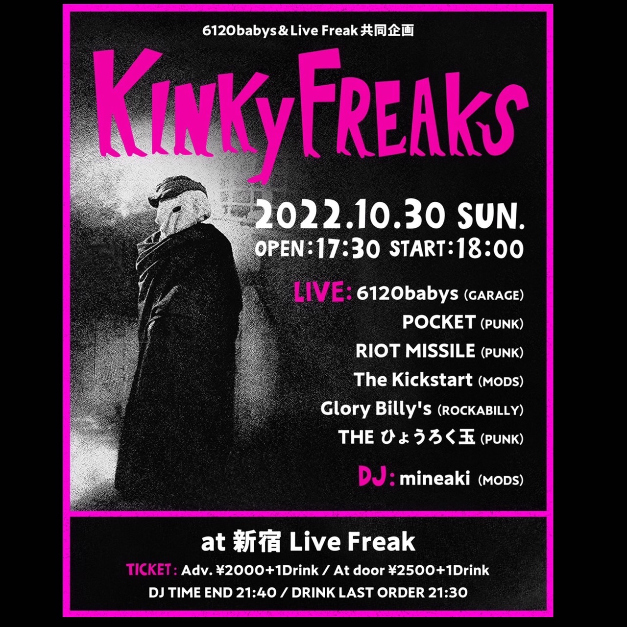 出演者 6120babys THE ひょうろく玉 Glory Billy's The Kickstart RIOT MISSILE POCKET DJ mineaki OPEN 17:30 / START 18:00 前売り2000円 当日2500円 (+1drink 600円)